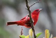 血雀雀科朱雀属鸟类,体重36-49克;体长155-182毫米。雄鸟除眼先、翼与尾为黑色外,通体为鲜红色;嘴鲜黄;雌鸟暗橄榄绿色,羽端较淡或带黄色;腰鲜黄;嘴较暗。虹膜褐色;嘴黄色;腿和脚褐色。…全部>>