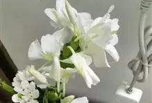 姜花又名野姜花。是姜科姜花属的多年生草本植物,茎高1-2米;叶片长圆状披针形或披针形,叶面光滑,叶背被短柔毛;穗状花序顶生,椭圆形,花芬芳,白色;蒴果卵状三棱形,微黄绿色;种子鲜红色,具橘红色的假种皮。…全部>>