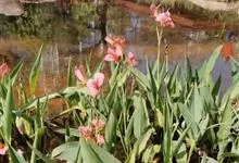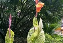 粉美人蕉:是一种球根草本植物。根茎延长,株高1.5-2米;茎绿色。叶片披针形;总状花序疏花,单生或分叉,稍高出叶上;苞片圆形,褐色,花黄色,无斑点;有多种园艺栽培品种,颜色从粉、橙红色及具带红色斑点…全部>>
