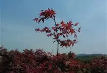 红枫,园艺种,槭树科槭属落叶小乔木,高5~8 m;树冠伞形,枝条开张,细弱。单叶对生,近圆形,薄纸质,掌状7~9深裂,裂深常为全叶片的1/2~1/3,基部心形,裂片卵状长椭圆形至披针形,先端尖,…全部>>