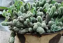 布纹球是大戟科、大戟属植物。植株小球形,直径8-12厘米。具棱8,整齐。表皮灰绿色中有红褐色纵横交错的条纹,顶部条纹较密。棱缘上有褐色小钝齿。雌雄异株,雌株球体较扁,雄株茎圆筒形,均为单生,…全部>>