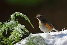 红胁蓝尾鸲俗名:蓝点冈子、蓝尾巴根子、蓝尾杰、蓝尾欧鸲。体型略小而喉白的鸲。特征为橘黄色两胁与白色腹部及臀成对比。雄鸟上体蓝色,眉纹白;亚成鸟及雌鸟褐色,尾蓝。…全部>>