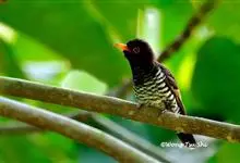 翠金鹃体长约17厘米,雄鸟上体辉绿色,头至背缀有很多棕栗色,颏和喉具黑褐色横斑;雌鸟上体自背以下具棕色羽缘。虹膜淡红褐色至绯红色,眼圈绯红色,嘴亮橙黄色,尖端黑色,脚暗褐绿色。…全部>>