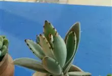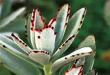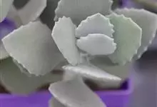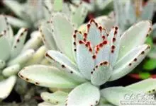 褐斑伽蓝是景天科伽蓝菜属的多年生多肉类植物,茎直立,多分枝,叶生于枝上,肉质叶片匙形,上面密被白色绒毛,下部全缘,叶缘上部有缺刻,缺刻处有深褐或棕色斑块。褐斑伽蓝原产非洲的马达加斯加岛。…全部>>