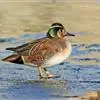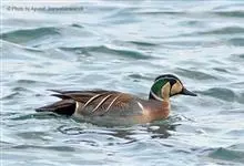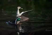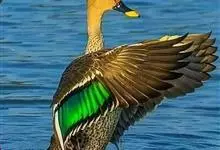 绿翅鸭是小型鸭类,体长37厘米,体重约0.5千克。嘴脚均为黑色。雄鸟头至颈部深栗色,头顶两侧从眼开始有一条宽阔的绿色带斑一直延伸至颈侧,尾下覆羽黑色,两侧各有一黄色三角形斑,在水中游泳时,极为醒目。…全部>>