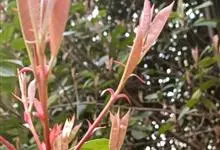 红叶石楠 是蔷薇科,石楠属杂交种,为常绿小乔木或灌木,乔木高可达5米、灌木高可达2米。叶片革质,长圆形至倒卵状、披针形,叶端渐尖,叶基楔形,叶缘有带腺的锯齿,花多而密,复伞房花序,花白色,梨果黄红色,…全部>>