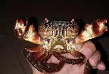 椰子蟹,十足目寄居蟹科椰子蟹属的节肢动物,又称八卦蟹。椰子蟹头胸部圆形而向前突出,腹部一部分折向头胸部腹面;足粗壮,左螯比右螯稍大;鳃腔的内壁有多丛血管,可助呼吸。椰子蟹能用钳子弄破椰子的外壳,…全部>>
