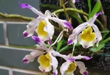 肿节石斛,是兰科石斛属多年生草本植物。肿节石斛茎斜立或下垂,肉质,圆柱形;叶纸质,长圆形;花序生于已落叶老茎上部,花白色,上部紫红色,有香气;花瓣宽长圆形,唇瓣白色,中部以下金黄色,上部紫红色,…全部>>