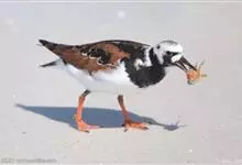 翻石鹬:体重82-135克,体长180-240毫米。体型高矮兼称,看起来十分的滑稽。它们在繁殖季时体色非常醒目,由栗色、白色和黑色交杂而成,嘴短,黑色,脚橙红色。到了冬天,翻石鹬身上的栗红色就会消失,…全部>>