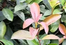 红叶石楠 是蔷薇科,石楠属杂交种,为常绿小乔木或灌木,乔木高可达5米、灌木高可达2米。叶片革质,长圆形至倒卵状、披针形,叶端渐尖,叶基楔形,叶缘有带腺的锯齿,花多而密,复伞房花序,花白色,梨果黄红色,…全部>>