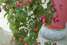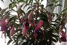 倒挂金钟是柳叶菜科倒挂金钟属亚灌木植物。茎直立,多分枝;幼枝带红色,被短柔毛与腺毛,老时渐无毛;叶对生,卵形或窄卵形,脉常带红色;常带红色,被短柔毛与腺毛;花筒红色,筒状钟形,…全部>>