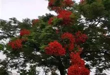 凤凰木 Raf.) ,别名火树、红花楹、凤凰花、火凤凰、金凤花、红楹,是豆科凤凰木属高大落叶乔木,树皮灰褐色,粗糙。二回偶数羽状复叶互生,矩圆形,两面均被柔毛。伞房式总状花序,花大,花瓣5枚,圆形,…全部>>