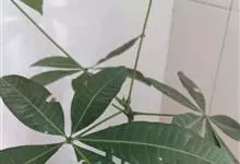瓜栗 Walp. ),俗称发财树,木棉科小乔木,高4-5米,树冠较松散,幼枝栗褐色,无毛。小叶具短柄或近无柄。花单生枝顶叶腋;花梗粗壮,被黄色星状茸毛,脱落;萼杯状,近革质;花瓣淡黄绿色,狭披针形…全部>>