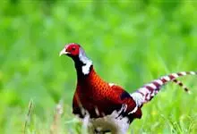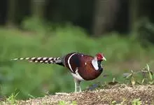 白颈长尾雉:大型鸡类,体长81厘米,体型大小和雉鸡相似。雄鸟头灰褐色,颈白色,脸鲜红色,其上后缘有一显著白纹,上背、胸和两翅栗色,上背和翅上均具1条宽阔的白色带,极为醒目;下背和腰黑色而具白斑;腹白…全部>>