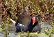 黑水鸡:是鹤形目、秧鸡科的鸟类,共有12个亚种。中型涉禽,体长24-35厘米。嘴长度适中,鼻孔狭长;头具额甲,后缘圆钝;嘴和额甲色彩鲜艳。翅圆形,第2枚初级飞羽最长,或第2枚和第3枚初级飞羽等长,…全部>>