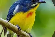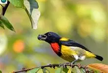 红胸啄花鸟:体重5-10克,体长60-92毫米。体形纤小。雄鸟上体呈辉亮的金属绿色;下体棕黄,胸部具一朱红色块斑,极易与其他啄花鸟区别。雌鸟上体呈橄榄绿,下体棕黄色。虹膜褐色,嘴褐黑色或角灰色,…全部>>