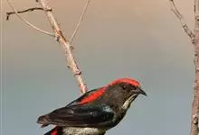 朱背啄花鸟:体重6-8克,体长81-97毫米。是一种小型的黑色及红色啄花鸟。雄鸟顶冠、背及腰猩红色,两翼、头侧及尾黑,两胁灰,下体余部白色。雌鸟上体橄榄色,腰及尾上覆羽猩红,尾黑。亚成鸟清灰色,嘴橘黄,…全部>>