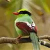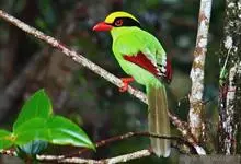 蓝绿鹊:中型鸟类,共有5个亚种。体长36-38厘米。尾长,嘴、脚红色。通体羽色主要为草绿色,宽阔的黑色贯眼纹向后延伸到后颈,在绿色的头侧极为醒目。两翅栗红色,内侧飞羽具黑色次端斑和白色尖端。尾绿色,…全部>>