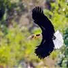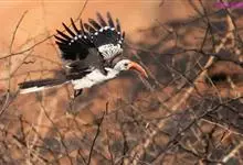 花冠皱盔犀鸟雄鸟体长约105厘米,雌鸟较小。尾白,雄雌两性的背、两翼及腹部均为黑色,但雄鸟头部奶白色,枕部具略红的丝状羽,裸出的喉囊上具明显的黑色条纹。雌鸟头颈黑,喉囊蓝色。成对或小群飞于森林上空,…全部>>