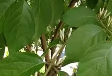 山银花在华南地区野外山林生长。木质藤本,长2~5m。树皮黄褐色渐次变为白色,嫩时有短柔毛。叶对生,卵圆形至椭圆形,长4~8cm,宽3.5~5cm,上面绿色,主脉上有短疏毛,下面带灰白色,密生白色短柔…全部>>