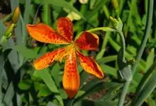 射干 Redouté)是鸢尾科射干属多年生草本植物。根状茎为不规则的块状,斜黄色或黄褐色;花橙红色,散生紫褐色的斑点;花药呈条形;子房下位,倒卵形;蒴果倒卵形或长椭圆形;种子圆球形,黑紫色,有光泽。…全部>>