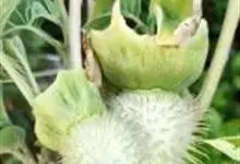 曼陀罗,茄科曼陀罗属一年生大型草本植物,全株光滑。有臭气;叶呈广卯形,边缘具不规则波状浅齿裂;花单生于枝杖间或叶腋,直立,有短梗;花萼是筒状裂片三角形,颜色为白色或淡紫色;果实为蒴果卵状,…全部>>