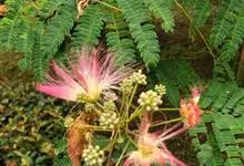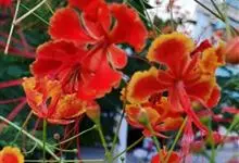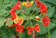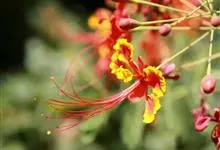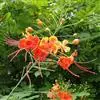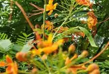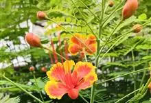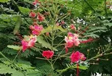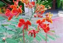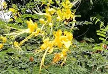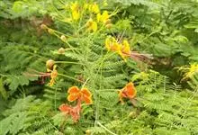 洋金凤 Sw.),豆科小凤花属灌木状或小乔木植物,枝无毛,绿或粉绿色;二回羽状复叶;总状花序伞房状,萼片无毛,花瓣橙红或黄色,圆形,花丝红色,子房无毛,花柱橙黄色;荚果窄而薄,…全部>>