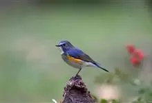 红胁蓝尾鸲俗名:蓝点冈子、蓝尾巴根子、蓝尾杰、蓝尾欧鸲。体型略小而喉白的鸲。特征为橘黄色两胁与白色腹部及臀成对比。雄鸟上体蓝色,眉纹白;亚成鸟及雌鸟褐色,尾蓝。…全部>>