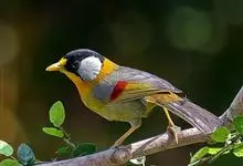 银耳相思鸟小型鸟类,体长14~18厘米。头顶黑色,耳羽银灰色,前额橙黄色;外侧飞羽橙黄色,基部朱红色,极为鲜艳、醒目。尾圆形,尾上、尾下覆羽朱红色,尾暗灰褐色,外侧尾羽橙黄色,其余上体橄榄绿或橄榄黄色。…全部>>