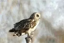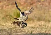 短耳鸮又名小耳木兔、田猫王、夜猫子等,是鸮形目鸱鸮科耳鸮属中小型猛禽动物。成鸟面盘显著,眼周黑色;眼先及内侧眉纹灰白色,面盘余部棕黄色杂以黑色细羽干纹;耳簇羽短小而几乎不外露,…全部>>