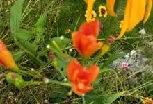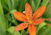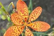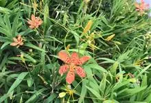 射干 Redouté)是鸢尾科射干属多年生草本植物。根状茎为不规则的块状,斜黄色或黄褐色;花橙红色,散生紫褐色的斑点;花药呈条形;子房下位,倒卵形;蒴果倒卵形或长椭圆形;种子圆球形,黑紫色,有光泽。…全部>>