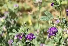 紫苜蓿,豆科苜蓿属多年生宿根草本植物,茎直立、丛生或匍匐,呈四棱形,多分枝;托叶较大,卵状披针形,小叶片呈倒卵状长圆形;花朵是成族状的总状花序;花梗呈尊钟状,花冠紫色花;果实螺旋形,…全部>>