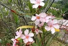 夹竹桃,又名红花夹竹桃、欧洲夹竹桃,是夹竹桃科夹竹桃属的一种常绿直立大灌木,枝条灰绿色,含水液。叶披针形,3叶轮生。聚伞花序顶生,花冠粉红至深红色,花冠漏斗状,有特殊香味。蓇葖果,圆柱形。种子长圆形,…全部>>