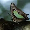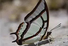 大二尾蛱蝶两翅正面黑色,中域有一浅绿色大型宽带纹,两翅反面浅绿色,中域有一缀黑边的褐色弧纹,亚外缘还有一深褐色横纹,后翅各有尾突两条,…全部>>