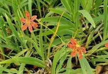 射干 Redouté)是鸢尾科射干属多年生草本植物。根状茎为不规则的块状,斜黄色或黄褐色;花橙红色,散生紫褐色的斑点;花药呈条形;子房下位,倒卵形;蒴果倒卵形或长椭圆形;种子圆球形,黑紫色,有光泽。…全部>>