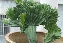 麒麟掌,是大戟科大戟属多年生植物。为金刚纂的带化变异变种。麒麟掌的株乳汁丰富;它的茎圆柱状,上部多分枝,绿色;叶互生,稀少,常生于嫩枝顶端脊上,倒卵形、倒卵状长圆形或匙形,顶端钝圆,具小凸尖,全缘,…全部>>