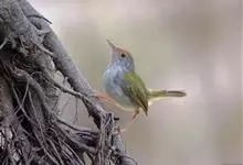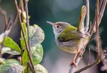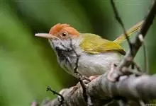 普通缝叶莺,是雀形目鹅科莺亚科缝叶莺属一种。体长10-14厘米,体重7-10克,雄鸟前额棕红,头顶至枕棕橄榄褐,上体橄榄绿染黄,飞羽及尾羽暗褐;繁殖期雄鸟的中央尾羽特形延长,下体淡皮黄白色。…全部>>