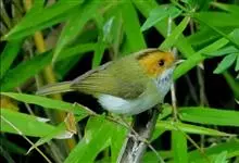 棕脸鹟莺:体长10厘米,是一种色彩亮丽而有特色的莺鸟。头栗色,具黑色侧冠纹。上体绿,腰黄色。下体白,颏及喉杂黑色点斑,上胸沾黄。与栗头鹟莺的区别在头侧栗色,白色眼圈不显著且无翼斑。…全部>>