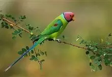 紫红头鹦鹉是鹦形目鹦鹉科的鸟类。鸟体为绿色,头部中间为红色,下颏下方延伸到脸颊下方,环绕整个颈部有一条黑色的环状羽毛,并连接一条蓝绿色的条状羽毛。…全部>>