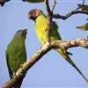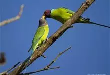 紫红头鹦鹉是鹦形目鹦鹉科的鸟类。鸟体为绿色,头部中间为红色,下颏下方延伸到脸颊下方,环绕整个颈部有一条黑色的环状羽毛,并连接一条蓝绿色的条状羽毛。…全部>>