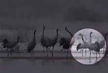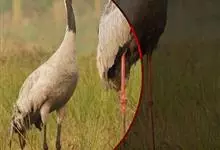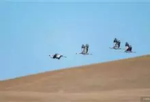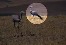 蓑羽鹤大型涉禽,体长68~92厘米,是鹤类中个体最小者。通体蓝灰色,眼先、头侧、喉和前颈黑色,眼后有一白色耳簇羽极为醒目。前颈黑色羽延长,悬垂于胸部。脚黑色,飞翔时翅尖黑色。…全部>>