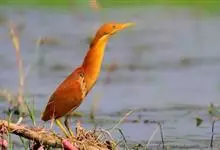 栗苇鳽是一种中型涉禽。体长30-38厘米。外形和紫背苇鳽相似。雄鸟上体从头顶至尾包括两翅飞羽和覆羽全为同一的栗红色,下体淡红褐色,喉至胸有一褐色纵线,胸侧缀有黑白两色斑点,野外特征极为明显,容易辨认。…全部>>
