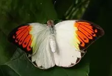 鹤顶粉蝶是鳞翅目粉蝶科鹤顶粉蝶属昆虫,又称端红蝶。雄蝶翅白色,前翅前缘及外缘黑色,自前缘二分之一处至外缘近后角处有黑色锯齿状斜纹,围住顶部三角形赤橙色斑,…全部>>