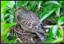 珠颈斑鸠,别名花斑鸠、珍珠鸠、花脖斑鸠、鸪鹪,是鸠鸽科副斑鸠属鸟类。体型中等,体长27~34cm,体重120~205g,雌鸟和雄鸟羽色相似,但雌鸟不如雄鸟羽色亮泽。珠颈斑鸠前额至头顶羽色稍淡,…全部>>
