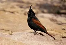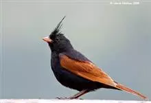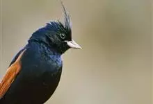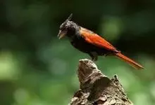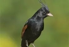 凤头鹀:属小型鸣禽,体重21-31克,体长134-175毫米。以头顶的细长羽冠为特征,雄鸟全身几乎均为黑色具蓝色光泽,两翅和尾以及尾上覆羽栗红色。雌鸟具短的褐色羽冠,上体暗橄榄褐色,…全部>>