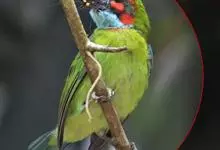 金喉拟啄木鸟,是须鴷科、拟啄木鸟属的鸟类。金喉拟啄木鸟为小型鸟类,体长19-24厘米。额深红色,头顶金黄色,后枕具一大块深红色斑,耳羽和头侧银灰色,上体草绿色,颏和上喉金黄色,下喉淡银灰色,…全部>>