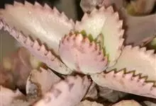 棒叶落地生根是景天科、落地生根属植物。茎直立、粉褐色。叶圆棒形,上表面有沟、粉色,有红褐斑。叶片交互对生,交叉排列成十字形。叶端锯齿上长有很小的幼株、落地后即可生根成活。原产非洲马达加斯加。…全部>>