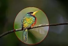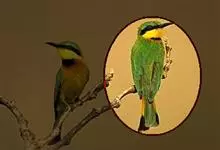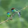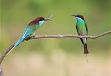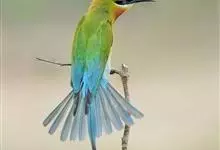 蓝喉蜂虎中型鸟类,体长26~28厘米。头顶至上背栗红色或巧克力色,过眼线黑色,腰和尾蓝色,翼蓝绿色,腰及长尾浅蓝,中央尾羽延长成针状,明显突出于外。颏喉蓝色,其余下体和两翅绿色。嘴细长而尖,黑色,…全部>>