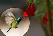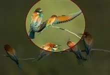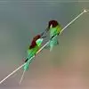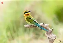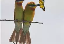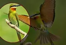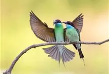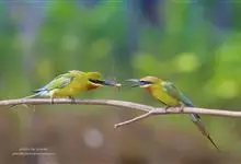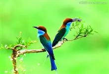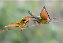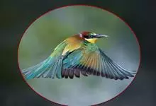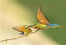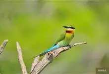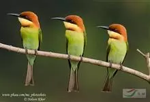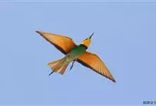 栗喉蜂虎是蜂虎科蜂虎属的鸟类。有热带鸟类羽毛艳丽的特征:喉部是栗红色的,黑色的过眼纹,翅膀和背部是绿色的,尾翼是蓝色的,飞行时翅膀下面的羽毛是橙黄色的,在阳光的照射下,它们全身闪烁着金属般的艳丽光泽,…全部>>