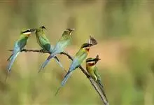 蓝颊蜂虎:是蜂虎科、蜂虎属的鸟类,共有2个亚种。体长27-33厘米,翼展46-49厘米,体重38-50克。嘴形细长而下弯,先端尖,…全部>>
